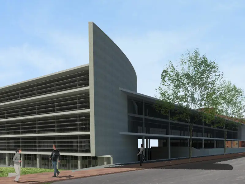 Por su parte, el segundo cuerpo, identificado como “B”, se desarrolla a partir de una traza curva y alcanza una altura de cuatro pisos más un semisótano.