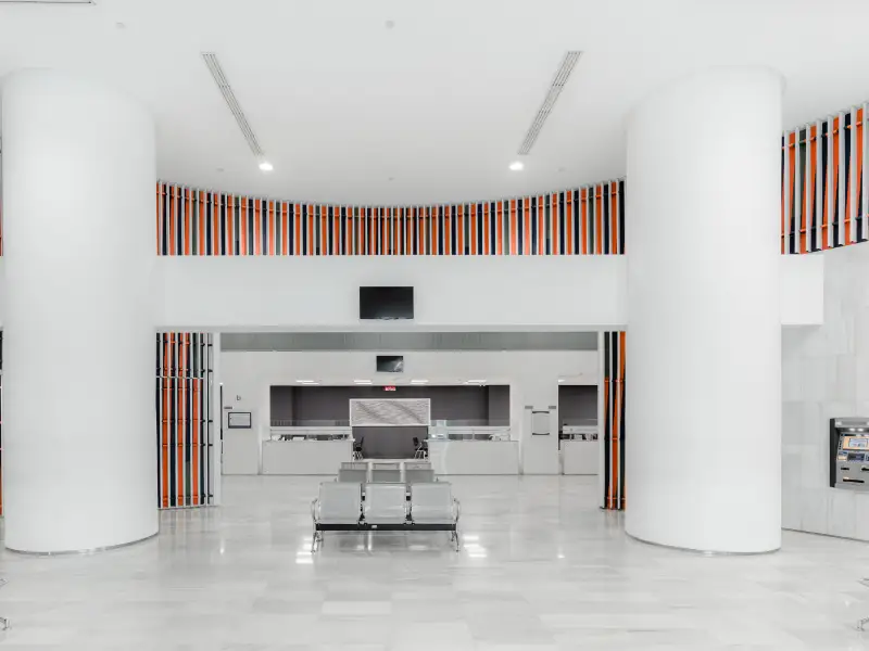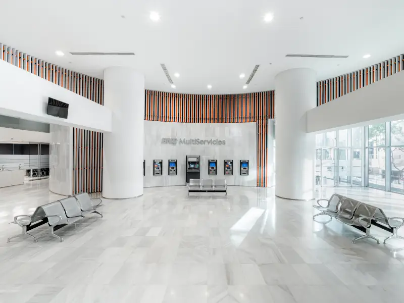 Las edificaciones bancarias modernas, como la agencia del Banco Nacional de Crédito El Rosal, reflejan una evolución tecnológica y arquitectónica orientada al confort, seguridad y funcionalidad del usuario. En un espacio de 816,58 m², la distribución integra de manera armónica las áreas de atención al público, gerencia y servicios, destacando un diseño central amplio y luminoso con doble altura, formas curvas y contrastes de color que realzan la identidad corporativa del BNC.